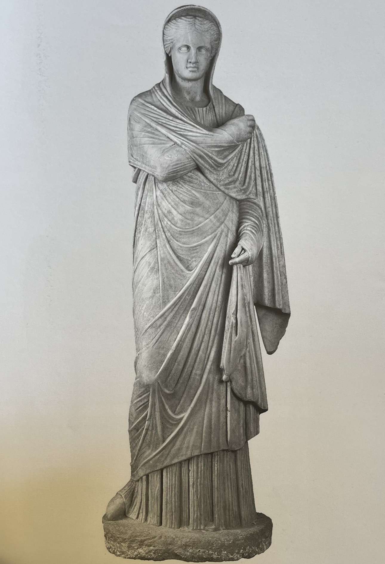 Στην κορυφή του κρανίου, κάτω από το ιμάτιο, διακρίνεται τμήμα πιθανόν από κεφαλόδεσμο που διασώζει ίχνη κόκκινου χρώματος. Δεν αποκλείεται να πρόκειται για τη vitta, ένα υφασμάτινο μαντήλι για το δέσιμο των μαλλιών, όπως σημειώνει η Ελένη Παπαγιάννη. Η γυναίκα φορά, εξάλλου, κλειστά υποδήματα και όχι σανδάλια, όπως θα περίμενε κανείς στον συγκεκριμένο τύπο αγάλματος. Ανήκει στην «οικογένεια» που βρέθηκε στο βάθρο του Παλατιανού και σύμφωνα με τις επιγραφές ταυτίζεται με τη Ρωμαία Αμμία Μενάνδρου.