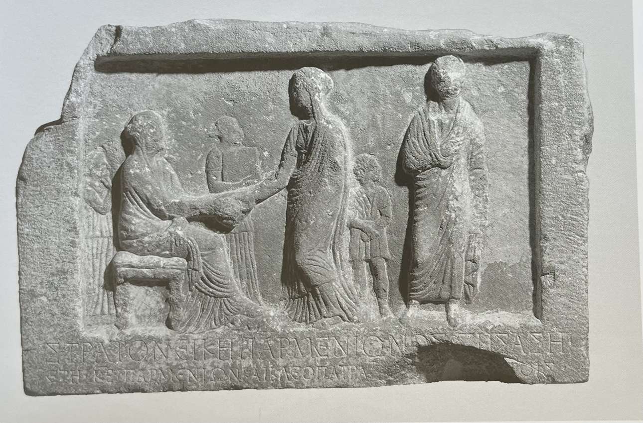 Οι δυο τους χαιρετιούνται σφίγγοντας το δεξί χέρι στο μοτίβο της δεξίωσης. Ανάμεσά τους εικονίζεται σε μικρότερη κλίμακα όρθια θεραπαινίδα που κρατά ένα κιβωτίδιο. Μια δεύτερη υπηρέτρια στέκεται όρθια πίσω από την καθιστή γυναίκα. Στη δεξιά άκρη ένας άνδρας συνοδεύεται από τον δούλο του.
