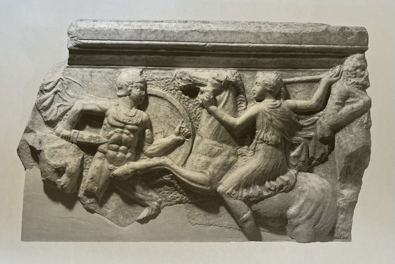 Τμήμα από αττική σαρκοφάγο με την παράσταση Αμαζονομαχίας, που βρέθηκε στην Πλατανιά Ευζώνων τον Μάρτιο του 1961. Η έφιππη πολεμίστρια καλπάζει προς τα αριστερά εναντίον ενός πεζού Ελληνα. Η Αμαζόνα φορά κοντό χιτώνα και στο δεξί χέρι κρατά δόρυ, ενώ στο αριστερό τα χαλινάρια του αλόγου.