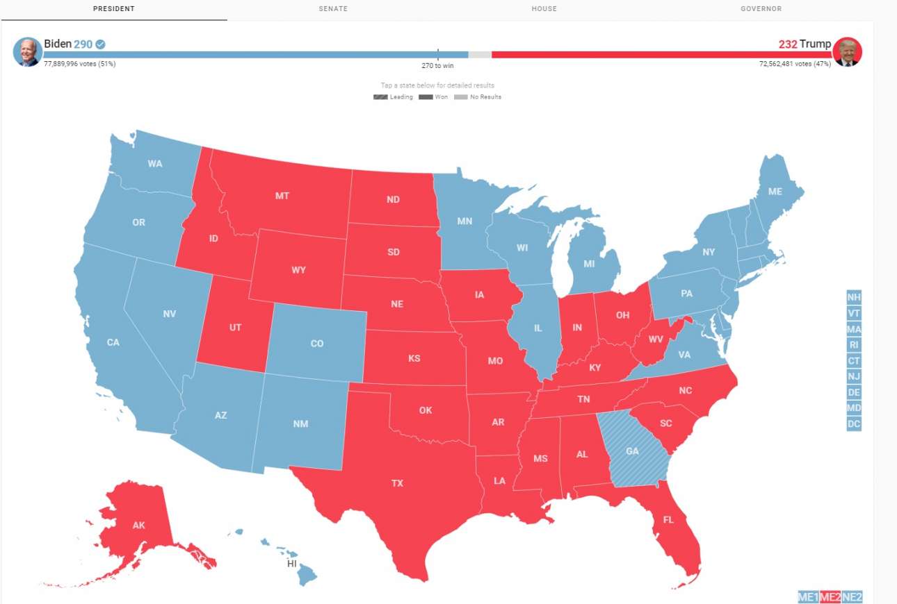 Η νίκη του Μπάιντεν στην πολιτεία αυτή σημαίνει ότι θα εξασφαλίσει τουλάχιστον 290 εκλέκτορες στο σώμα που αναδεικνύει τον νικητή των εκλογών – πολύ περισσότερες από τις 270 ψήφους που χρειαζόταν. Κερδίζει επίσης καθαρά τη λαϊκή ψήφο, παναμερικανικά, με διαφορά 5,2 εκατομμυρίων, ή 3,4%.