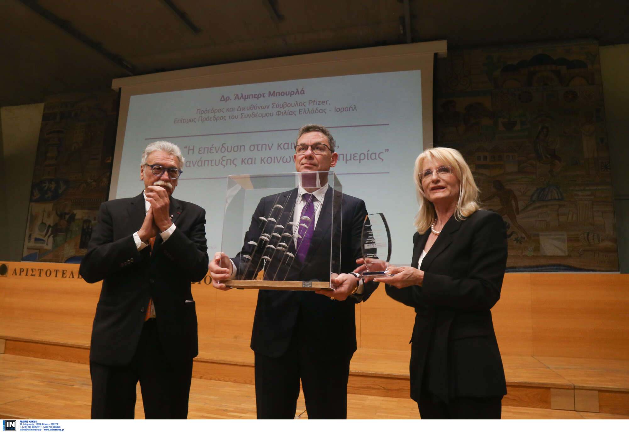Μ’ αυτά τα λόγια, ο διευθύνων σύμβουλος της Pfizer, Αλμπερτ Μπουρλά, ευχαρίστησε για την τιμή της σημερινής αναγόρευσής του σε επίτιμο πρόεδρο του Συνδέσμου Φιλίας Ελλάδας – Ισραήλ, σε μια τελετή με κύρια χαρακτηριστικά τη γεμάτη με κόσμο αίθουσα τελετών του ΑΠΘ και τη συγκίνηση του ίδιου όχι μόνο για τον τίτλο που τού απονεμήθηκε, αλλά και για το γεγονός ότι, περιστοιχισμένος από φίλους και συγγενείς, επέστρεψε στο «σπίτι» του, αφού από το ίδιο πανεπιστήμιο αποφοίτησε πριν από χρόνια.