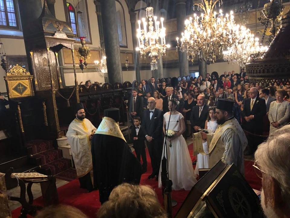 Κουμπάρος του ζευγαριού το οποίο ευλόγησε ο Οικουμενικός Πατριάρχης Βαρθολομαίος (φωτογραφία κάτω), ήταν ο πρεσβευτής της Ελλάδας στην Αγκυρα, Πέτρος Μαυροειδής.