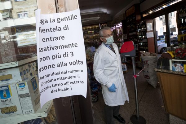 Εξω από το σουπερμάρκετ της Ρώμης η επιγραφή προειδοποιεί τους πελάτες: «Παρακαλούμε, μην εισέρχεσθε περισσότεροι από τρεις κάθε φορά»… (EPA/MASSIMO PERCOSSI)
