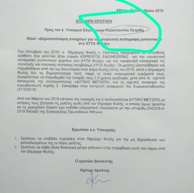 Στην ερώτησή του, ο κ. Αρσένης ανέφερε ότι το 2015 ο δήμαρχος Φυλής κ. Παππούς προχώρησε σε απευθείας ανάθεση δύο μελετών στην εταιρεία «ASPROFOS ENGINEERING» για την αναλυτική καταγραφή ρυπαντικών φορτίων στο ΧΥΤΑ Φυλής και την αναλυτική καταγραφή της ποσοτικής και ποιοτικής σύστασης αποβλήτων ΧΥΤΑ Φυλής.