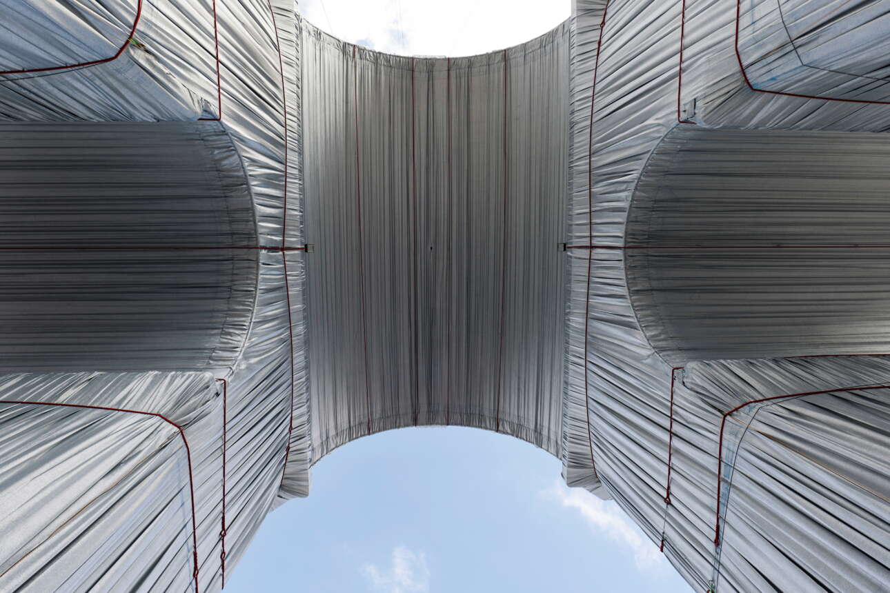 Για το «πακετάρισμα» της Αψίδας χρειάστηκαν 25.000 τετραγωνικά μέτρα γαλάζιου, ανακυκλωμένου πλαστικού, που συγκρατείται από 3.000 μέτρα κόκκινου σκοινιού. Η εγκατάσταση θα παραμείνει μέχρι τις 3 Οκτωβρίου.