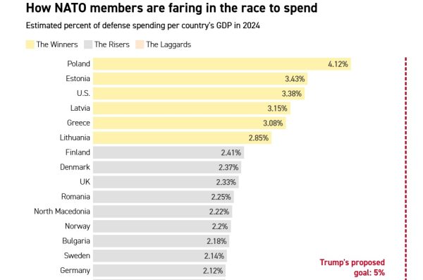 Υπό τον ξεκάθαρο τίτλο «Ο Τραμπ θέλει τα μέλη του ΝΑΤΟ να δαπανούν περισσότερα για την άμυνα. Δείτε ποιοι είναι αυτοί που πραγματικά πληρώνουν», η αμερικανική έκδοση του Politico περιγράφει το περιβάλλον αυξημένων γεωπολιτικών πιέσεων καθώς οι ηγέτες της Συμμαχίας συγκεντρώνονται την Τρίτη 24 και την Τετάρτη 25 Ιουνίου στη Χάγη.
