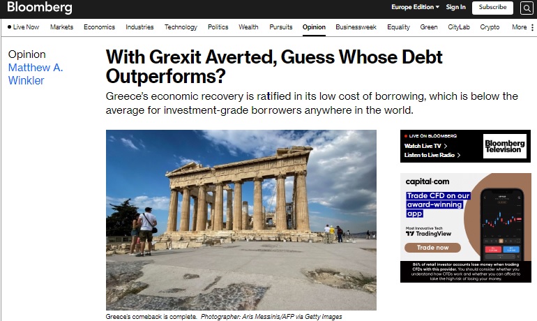 Το Bloomberg, σε άρθρο του συνιδρυτή και αρχισυντάκτη επί τιμή, Μάθιου Γουίνκλερ, επισημαίνει ότι η ανάκαμψη της οικονομίας επικυρώνεται από το χαμηλό κόστος δανεισμού της. «Με την αποτροπή του Grexit, μαντέψτε ποιανού το χρέος υπεραποδίδει; Η οικονομική ανάκαμψη της Ελλάδας επικυρώνεται από το χαμηλό κόστος δανεισμού της, το οποίο είναι κάτω από τον μέσο όρο των δανειοληπτών επενδυτικής βαθμίδας οπουδήποτε στον κόσμο» αναφέρει ο τίτλος του κειμένου στην ιστοσελίδα του Bloomberg –και ίσως η αναφορά στην «επενδυτική βαθμίδα», στρατηγικό εθνικό στόχο της χώρας μας, να μην είναι καθόλου τυχαία.