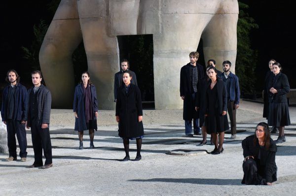 Πλησιάζοντας, ανάμεσα σε πραγματικά λίγους θεατές (το θέατρο έμοιαζε μισοάδειο), το ένα τρίτο των οποίων ήταν ξένοι (πολλοί Γάλλοι και Ιταλοί, αρκετοί Ισπανοί και Αμερικάνοι) η πρώτη εικόνα ήταν αυτή ενός γιγαντιαίου γυμνού, φαλακρού άνδρα που είχε την πλάτη γυρισμένη στους θεατές και το πρόσωπό του σχεδόν κρυβόταν πίσω από μια συστάδα δέντρων. Εγινε το ιδανικό σκηνικό για εκατοντάδες σέλφις και φωτογραφίσεις (ακόμα και η Λυδία Κονιόρδου μπαίνοντας κοντοστάθηκε για να το φωτογραφίσει). Πίσω μου νέα παιδιά έλεγαν ότι τους θυμίζουν τα τεράστια κυκλαδικά ειδώλια που άνοιγαν στην τελετή έναρξης των Ολυμπιακών Αγώνων του Δημήτρη Παπαϊωάννου. Σε άλλους θύμιζε το Γκόλουμ από τον Αρχοντα των Δαχτυλιδιών. Όταν σε υποδέχεται ένα τέτοιο σκηνικό, ουσιαστικά γκροτέσκο, αυτομάτως μπαίνεις σε μια διαδικασία, σε μια στάση για αυτό που θα ακολουθήσει. Σαν μια νύξη. Και όμως η παράσταση των 90 λεπτών ήταν τόσο φίνα, τόσο καθαρή, σχεδόν ανακουφιστικά απαλλαγμένη από νεωτερισμούς, ή κλεισίματα του ματιού από τον σκηνοθέτη προς το κοινό.