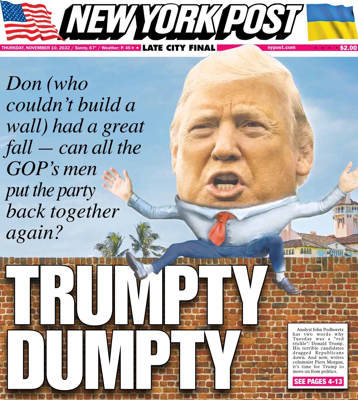Το πρωτοσέλιδο της Post την Πέμπτη καταλάμβανε ολόκληρο καρικατούρα του Τραμπ καθώς πάει να πέσει από τούβλινο τοίχο, αναφορά στο τείχος που υποσχόταν να υψώσει στα σύνορα με το Μεξικό για να σταματήσει την παράτυπη μετανάστευση, αλλά «δεν έχτισε».