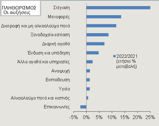 Με αυτή την πορεία ο πληθωρισμός, βάσει του Εναρμονισμένου Δείκτη Τιμών Καταναλωτή (ΕνΔΤΚ), διαμορφώθηκε σε 9,3% κατά μέσο όρο το 2022.