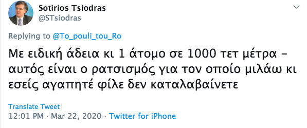 Ο ίδιος ο κ. Τσιόδρας, σε μήνυμά του στα social media και απαντώντας στις επικρίσεις που δέχτηκε για «λάθος μήνυμα» προς τους πολίτες που έχουν διαταχθεί να μείνουν σπίτι, είπε ότι η παρουσία του ως ψάλτου σττην εκλλησία έγινε «με ειδική άδεια». Σημείωσε ότι ήταν ένα άτομο σε 1.000 τ.μ. Και έκανε λόγο για «ρατσισμό».
