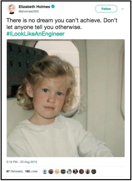 Το 2014 η νεοφυής εταιρεία αιματολογικών τεστ Theranos και η ιδρύτριά της, η εν λόγω κυρία, είχαν κατακτήσει το Εβερεστ των μπίζνες. Η Theranos ήταν μία εφαρμοσμένη επαναστατική ιδέα μίας γυναίκας που χαιρετίστηκε από τα media των ΗΠΑ σαν ιδιοφυΐα. Μάλιστα η Χολμς απόλαυσε και χαρακτηρισμούς του τύπου «είναι η νέα Στιβ Τζομπς», αφού είχε το συνήθειο (ή την έμπνευση) να ντύνεται στα casual και unisex μαύρα, όπως δηλαδή και ο ιδρυτής της Apple.