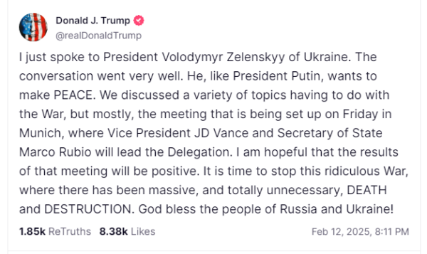 Ακολούθησε νέα ανάρτηση του Ντόναλντ Τραμπ στο Truth Social (τη δική του πλατφόρμα κοινωνικής δικτύωσης), στην οποία ο πρόεδρος των ΗΠΑ ανέφερε ότι η συζήτηση με τον ουκρανό ομόλογό του πήγε «πολύ καλά» και ότι «ο Ζελένσκι, όπως και ο Πούτιν, θέλει να επιτευχθεί ειρήνη».