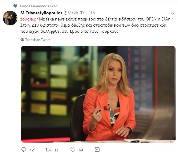 Με αφορμή το συγκεκριμένο θέμα, ο δημοσιογράφος και παρουσιαστής Μάκης Τριανταφυλλόπουλος κατηγόρησε την κυρία Στάη για fake news -σχόλιο στο οποίο έσπευσε αμέσως να κάνει like o υπουργός Αμυνας και φίλος του δημοσιογράφου, Πάνος Καμμένος (δείτε κάτω τη φωτογραφία από το Twitter) .