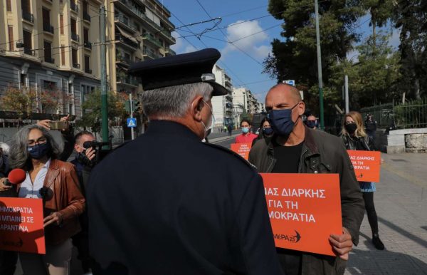 Κρατώντας πλακάτ με το σύνθημα «Αγώνας διαρκής για τη Δημοκρατία» και έχοντας πλάι του τη βουλευτή του κόμματος Σοφία Σακοράφα, ο κ. Βαρουφάκης πραγματοποίησε αυτό που είχε προαναγγείλει λίγες ώρες νωρίτερα μέσω Twitter.