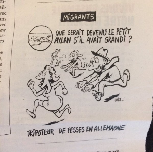 Το σκίτσο του Charlie Hebdo, υπό τον τίτλο «Μετανάστες», δείχνει δύο λάγνους ανθρώπους-χοίρους, με τη γλώσσα έξω και τα χέρια απλωμένα, να κυνηγούν δύο τρομαγμένες γυναίκες που τρέχουν για να σωθούν. Ως ένθεση στο σκίτσο, υπάρχει η γνωστή φωτογραφία του Αϊλάν να κείτεται στην άμμο. Το «θέμα» προκύπτει από τη λεζάντα που έχει η «σύνθεση»: «Τι θα γινόταν ο μικρός Αϊλάν αν μπορούσε να μεγαλώσει;» και η απάντηση είναι αρκούντως σκληρή: «ψηλαφητής οπίσθιων στη Γερμανία».