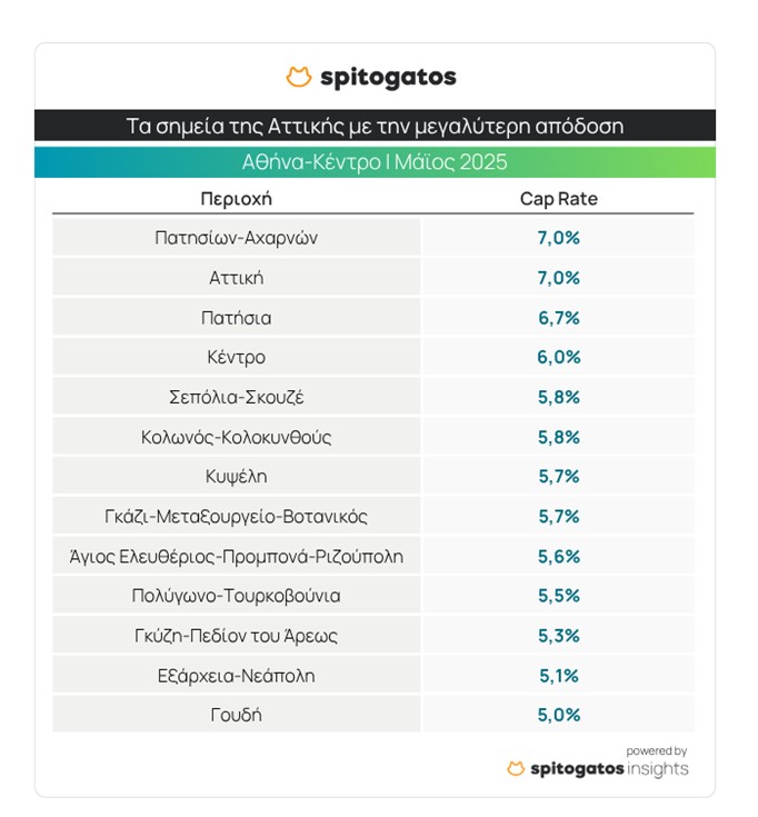 Στο πλαίσιο της Real Estate Expo που πραγματοποιήθηκε στην Αθήνα (30 Μαΐου – 1 Ιουνίου), ο CEO του Spitogatos, Δημήτρης Μελαχροινός, παρουσίασε — κατά τη διάρκεια του panel «Ποιες είναι οι νέες hot περιοχές της Αθήνας με τις υψηλότερες αποδόσεις;» — τις περιοχές της Αττικής, της Θεσσαλονίκης και της υπόλοιπης Ελλάδας με τις υψηλότερες αποδόσεις. Οι αποδόσεις αυτές υπολογίστηκαν βάσει του λόγου των ετησίων ζητούμενων μισθωμάτων προς τη ζητούμενη τιμή πώλησης (Cap Rate), σύμφωνα με τα στοιχεία του Spitogatos Insights.Η σχέση αυτή δείχνει πόσο αποδοτικό είναι ένα ακίνητο αν ενοικιαστεί μακροχρόνια (και όχι βραχυχρόνια ή με σκοπό την τουριστική εκμετάλλευση), σε σχέση με την αξία του.