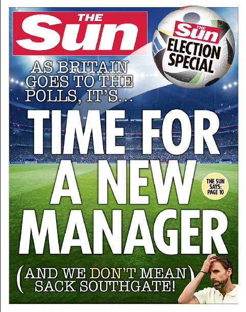 Για πρώτη φορά από το 2005, η ευρείας κυκλοφορίας εφημερίδα Sun με πρωτοσέλιδο και… ποδοσφαιρικό τίτλο «Είναι ώρα για νέο προπονητή – και δεν εννοούμε να απολυθεί ο Σάουθγκεϊτ» στήριξε τους Εργατικούς, εν μέσω ελπίδων για μια καλή πορεία της εθνικής Αγγλίας υπό τον Σάουθγκεϊτ στα γήπεδα του Euro 2024.