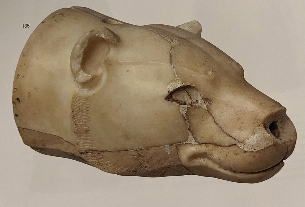 Ρυτό (δηλαδή δοχείο για πόσιμα υγρά ή τελετουργικές χοές) από το ανάκτορο της Κνωσού με τη μορφή κεφαλιού λέαινας, από υπόλευκο ημιδιάφανο ασβεστόλιθο. Η πλαστικότητα και η ακρίβεια των λεπτομερειών αποδεικνύει πόσο υψηλές δεξιότητας είχαν οι Μινωίτες καλλιτέχνες-λιθοξόοι. Δεν έχουν σωθεί πάντως τα ενθέματα του ρύγχους και των ματιών, τα οποία ήταν φτιαγμένα πιθανότατα από ημιπολύτιμες ύλες (όπως στο πασίγνωστο ρυτό σε μορφή κεφαλής ταύρου).