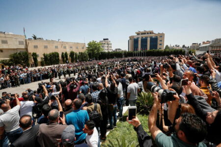 Χιλιάδες Παλαιστίνιοι παρέστησαν στην κηδεία της αμερικανοπαλαιστίνιας, χριστιανής δημοσιογράφου του Al Jazeera, η οποία σκοτώθηκε την Τετάρτη με μια σφαίρα στο κεφάλι την ώρα που κάλυπτε μια επέμβαση του ισραηλινού στρατού στον καταυλισμό προσφύγων της Τζενίν στην κατεχόμενη Δυτική Οχθη.