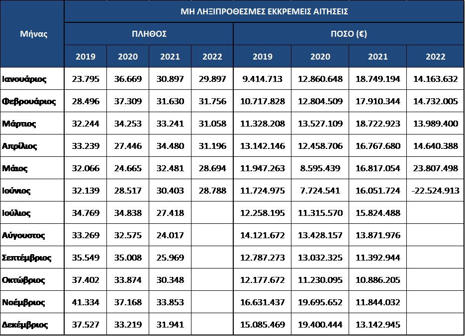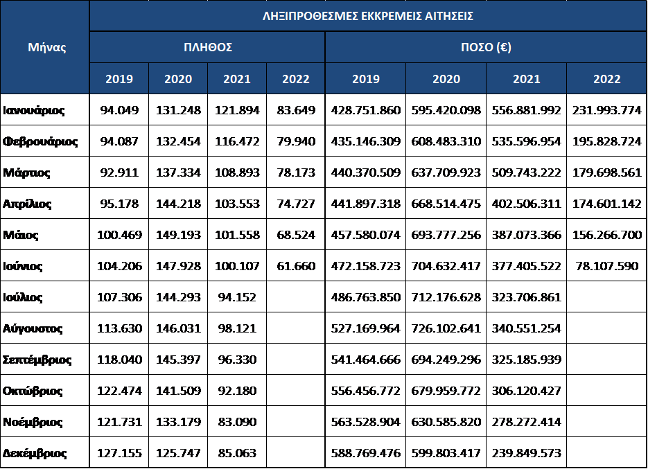Συγκεκριμένα, οι ληξιπρόθεσμες οφειλές τον Ιούνιο του 2020 ανέρχονταν σε 705 εκατ. ευρώ ενώ σήμερα ανέρχονται σε 78 εκατ. ευρώ, μειωμένες κατά 89%. Η αντίστοιχη μείωση σε σχέση με τον Ιούνιο 2021 είναι περίπου 80%. Η ραγδαία αυτή μείωση των ληξιπρόθεσμων οφειλών προς τους εν αναμονή συνταξιούχους οφείλεται στην μαζική εκκαθάριση των ληξιπρόθεσμων συντάξεων που έχει επιτευχθεί τους τελευταίους μήνες, δίνοντας προτεραιότητα στις παλαιότερες εκκρεμείς συντάξεις που συνοδεύτηκαν και με την καταβολή των αντίστοιχων αναδρομικών. Για την εκτίμηση της οφειλόμενης δαπάνης έχει αφαιρεθεί η εισφορά υπέρ υγείας και ο φόρος εισοδήματος. Επίσης, από τον 6/2022 έχουν συνυπολογιστεί και αφαιρεθεί οι οφειλές των υποψηφίων συνταξιούχων προς τον e-ΕΦΚΑ.