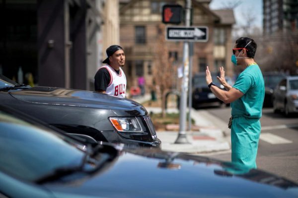 Νοσηλευτές σε αντιδιαδήλωση στο Ντένβερ, σταματούν τα οχήματα των υποστηρικτών του Τραμπ που απαιτούν τερματισμό των περιορισμών που έχουν επιβληθεί λόγω κορονοϊού