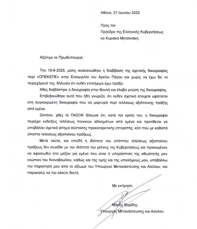 Μάλιστα ο κ. Βορίδης έστειλε επιστολή στον Πρωθυπουργό, ο οποίος απέδωσε την παραίτησή του στο… ΠΑΣΟΚ, το οποίο προανήγγειλε Προανακριτική για την περίπτωσή του.