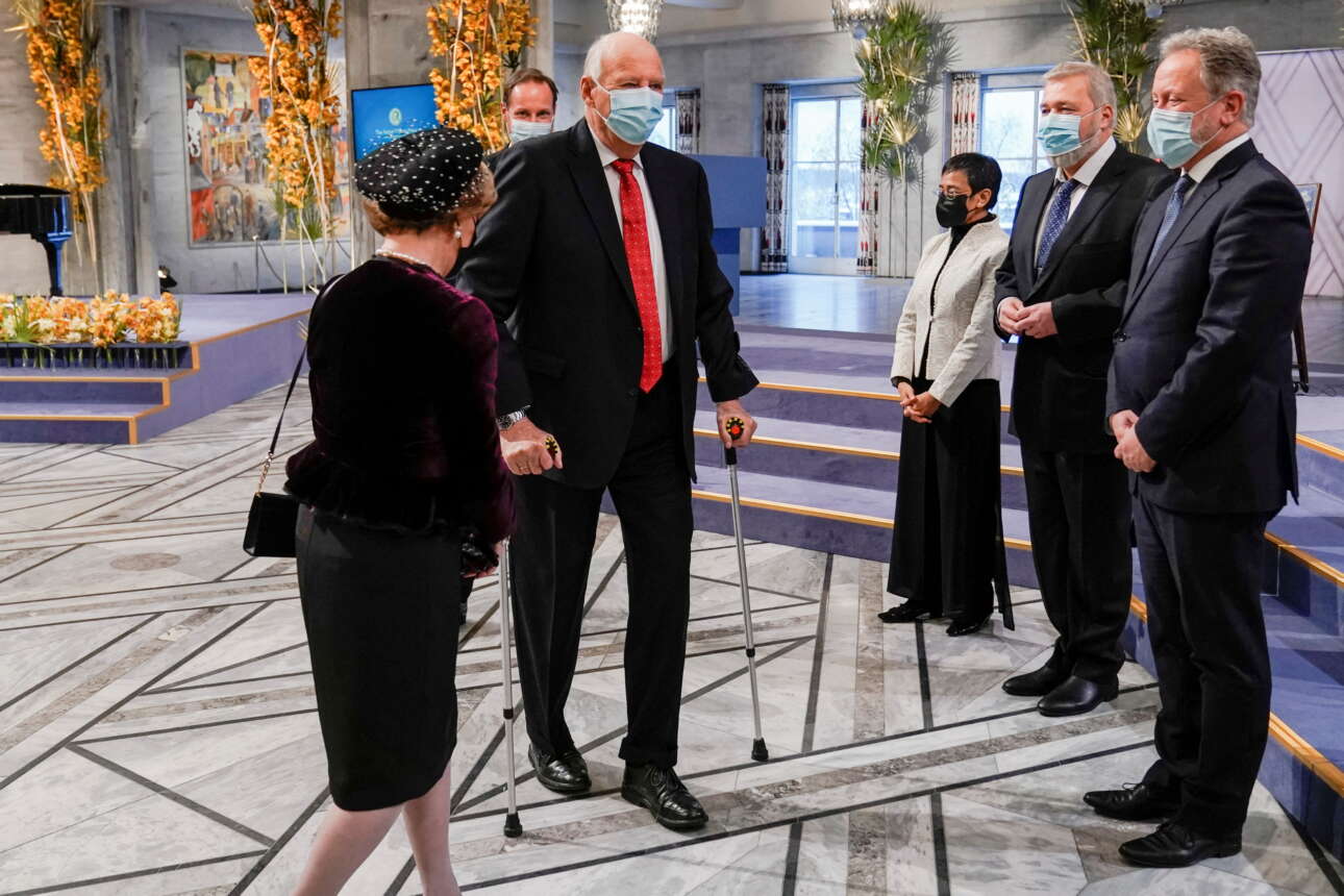 Στην τελετή βράβευσης των Ντμίτρι Μουράτοφ και Μαρία Ρέσα, που έγινε χωρίς προσκεκλημένους, λόγω της πανδημίας, παρέστησαν ο βασιλιάς Χάραλντ και η βασίλισσα Σόνια της Νορβηγίας.