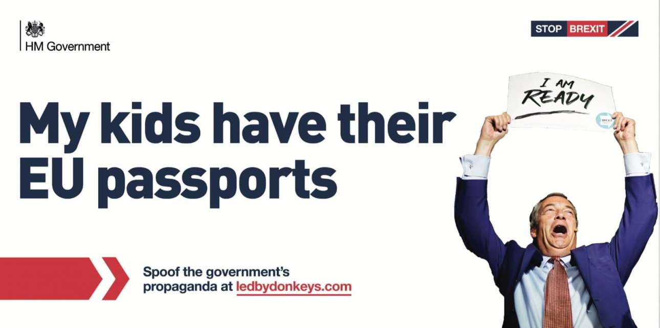 Οι αφίσες, που θα εμφανιστούν σε όλη τη χώρα αυτό το Σαββατοκύριακο, είναι μια ειρωνική απάντηση στην καμπάνια της κυβέρνησης και στις αντιφάσεις των πολιτικών που στηρίζουν την έξοδο από την ΕΕ. Την εκστρατεία χρηματοδότησε η ομάδα «Led By Donkeys» («Μας κυβερνούν γάιδαροι») που τάσσεται υπέρ της παραμονής στην ΕΕ, γράφει ο Guardian.