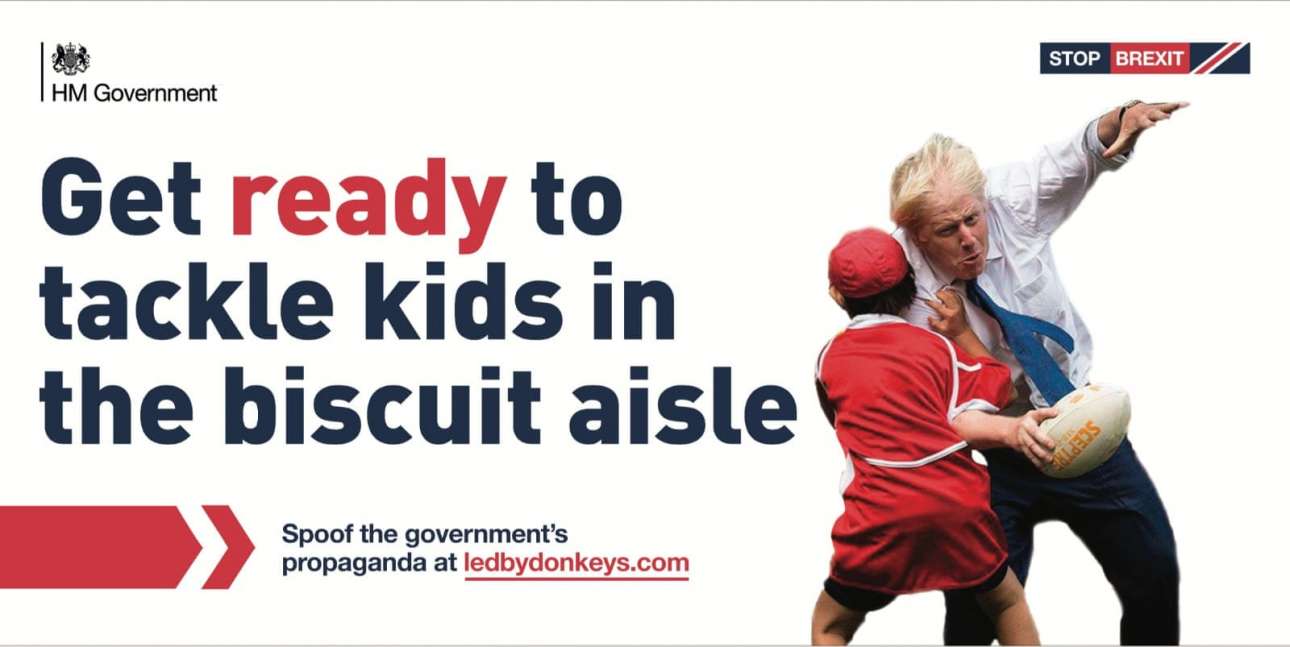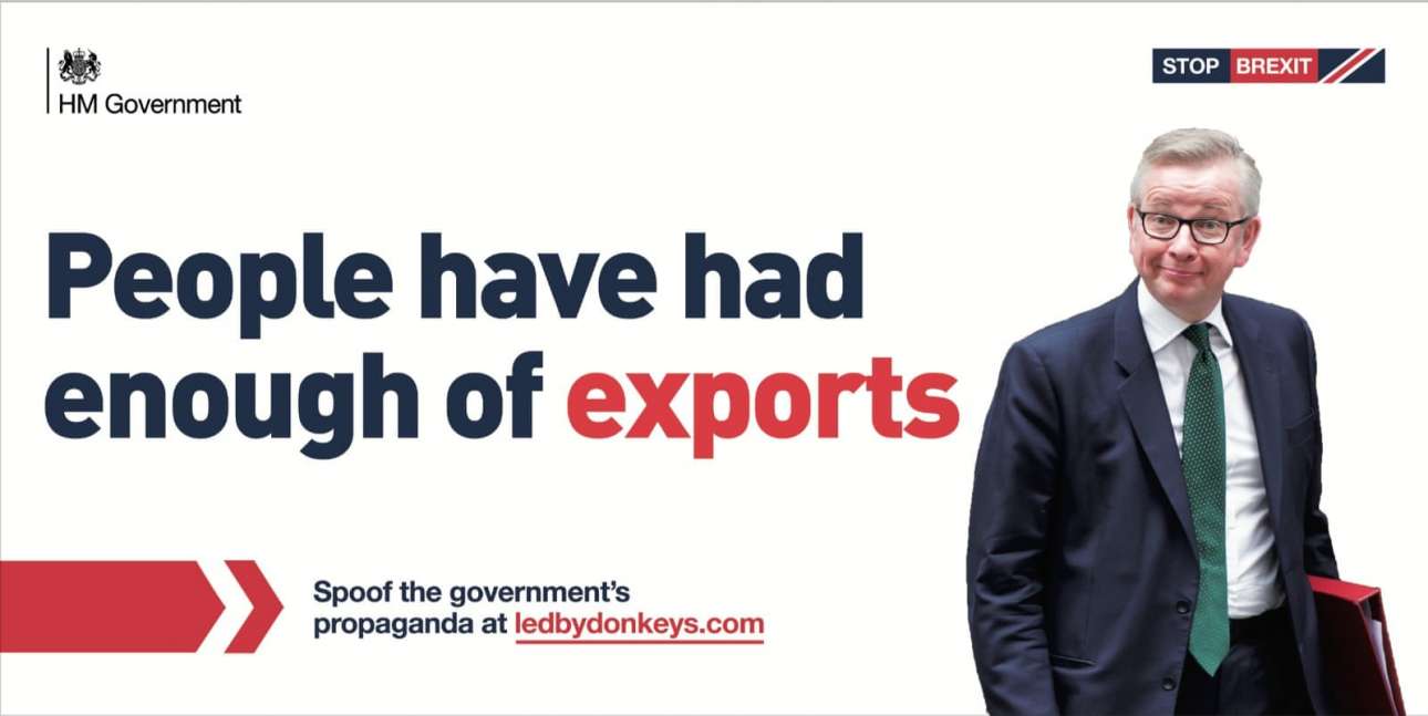 Ο Μάικλ Γκόουβ, στενός συνεργάτης του Τζόνσον, εμφανίζεται στην αφίσα να λέει ότι ο κόσμος βαρέθηκε τις εξαγωγές, ένα λογοπαίγνιο με παλιότερη δήλωσή του ότι ο κόσμος «κουράστηκε με τους ειδικούς» («exports» και «experts» αντίστοιχα).