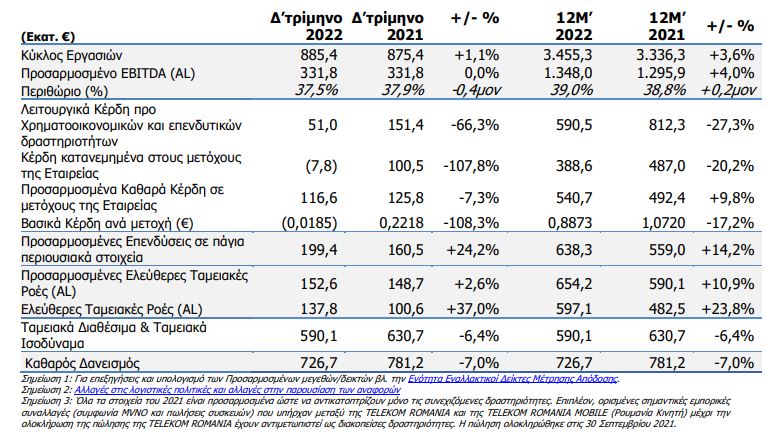 Αναλυτικά, όπως αναφέρεται στη σχετική ανακοίνωση, για το δ’ τρίμηνο του 2022, τα ενοποιημένα έσοδα του Ομίλου ΟΤΕ αυξήθηκαν κατά 1,1% και διαμορφώθηκαν σε 885,4 εκατ. ευρώ. Στην Ελλάδα, τα έσοδα αυξήθηκαν κατά 2,2%, στα 813,9 εκατ. ευρώ, κυρίως λόγω των ισχυρών επιδόσεων στην κινητή και στις υπηρεσίες ICT, ενώ και η προσαρμοσμένη κερδοφορία EBITDA (AL) σημείωσε αύξηση 3,2%, στα 331,8 εκατ. ευρώ. Τα έσοδα από υπηρεσίες λιανικής σταθερής μειώθηκαν κατά 5,5%, κυρίως λόγω μείωσης των εσόδων από υπηρεσίες φωνής. Τα έσοδα από υπηρεσίες κινητής αυξήθηκαν κατά 3,0% στο τρίμηνο. Τα έσοδα από υπηρεσίες περιαγωγής κατέγραψαν ένα ακόμα θετικό τρίμηνο, ενώ σε επίπεδο έτους κατέγραψαν επίπεδα ρεκόρ, αυξημένα κατά 48% σε σχέση με το 2021, ενώ ξεπέρασαν και τα προ πανδημίας επίπεδα του 2019, κατά πάνω από 20%.