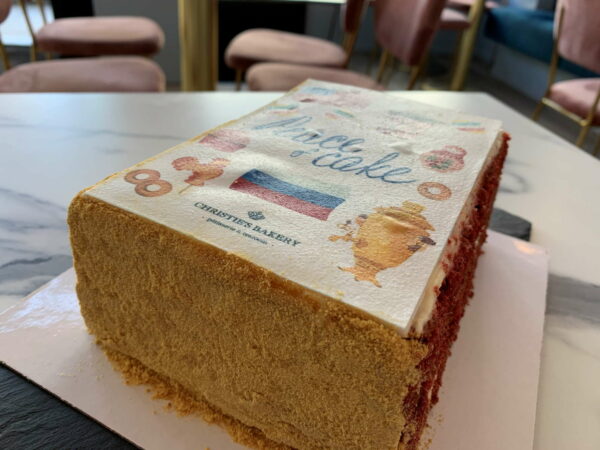 Οι λέξεις «Peace of Cake» είναι γραμμένες με μπλε γλάσο δίπλα σε σημαίες και σύμβολα των δύο χωρών: μια κούκλα ματριόσκα και ένα σαμοβάρι για τη Ρωσία και ένα αναψυκτικό Κόκα Κόλα και μαρσμέλοους για τις ΗΠΑ. Στο εσωτερικό του, το κέικ είναι μισό με γεύση μέλι, σύμφωνα με τη ρωσική παράδοση και μισό red velvet, δημοφιλές γλύκισμα στις ΗΠΑ.