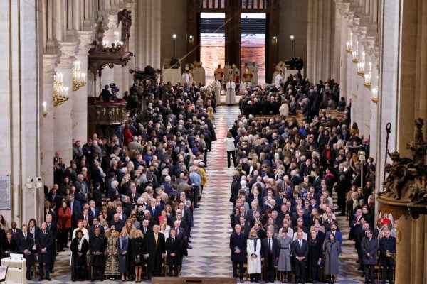 Τις εκδηλώσεις παρακολουθούσαν σαράντα ηγέτες από όλο τον κόσμο, υπό τις εκκλησιαστικές μελωδίες της χορωδίας. Ανάμεσά τους, ο εκλεγμένος Ντόναλντ Τραμπ, ο πρίγκιπας Ουίλιαμ -χωρίς την πριγκίπισσα Κέιτ- και άλλοι, που έχουν καταφθάσει στο γαλλικό έδαφος για τα θυρανοίξια και τις εκδηλώσεις. Προσκεκλημένη ήταν και η Πρόεδρος της Ελληνικής Δημοκρατίας Κατερίνα Σακελλαρόπουλου.