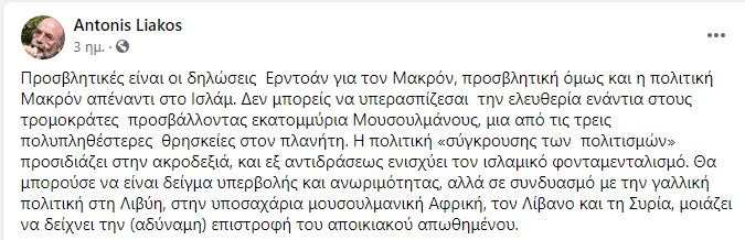 Προ ημερών ο καθηγητής Aντώνης Λιάκος (μέλος της Κεντρικής Επιτροπής Ανασυγκρότησης του ΣΥΡΙΖΑ και πρώην πρόεδρος της Επιτροπής Εθνικού Διαλόγου για την Παιδεία, επί κυβέρνησης Τσίπρα) είχε χαρακτηρίσει «προσβλητική» την πολιτική Μακρόν έναντι του Ισλάμ, κάνοντας λόγο για πολιτική «σύγκρουσης των πολιτισμών» που «προσιδιάζει στην ακροδεξιά, και εξ αντιδράσεως ενισχύει τον ισλαμικό φονταμενταλισμό».