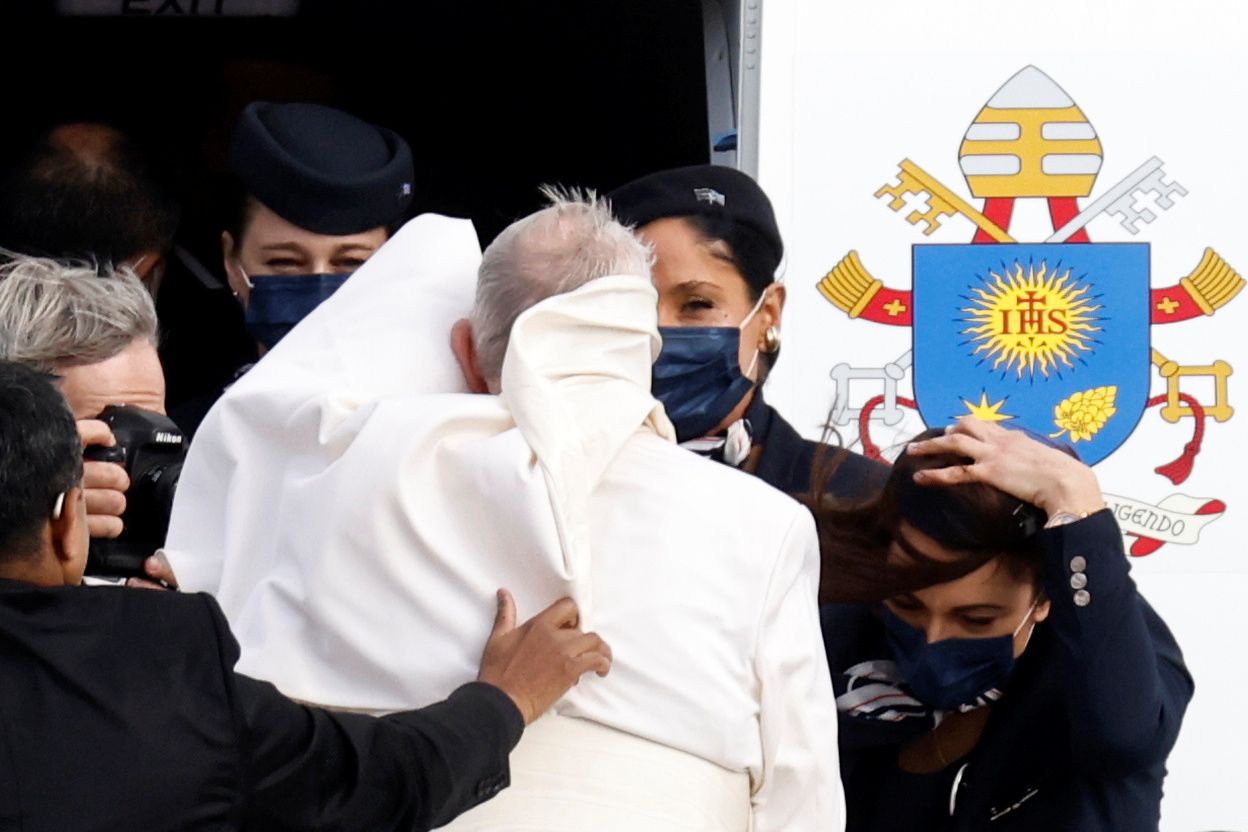 Ο δυνατός αέρας πάντως στο αεροδρόμιο του «Ελ. Βενιζέλος» ήταν υπαίτιος για ακόμη ένα συμβάν, καθώς πριν ανέβει στο αεροπλάνο ο πονίφικας κουκουλώθηκε από το ράσο του, με αποτέλεσμα να χρειαστεί η παρέμβαση των συνεργατών του.