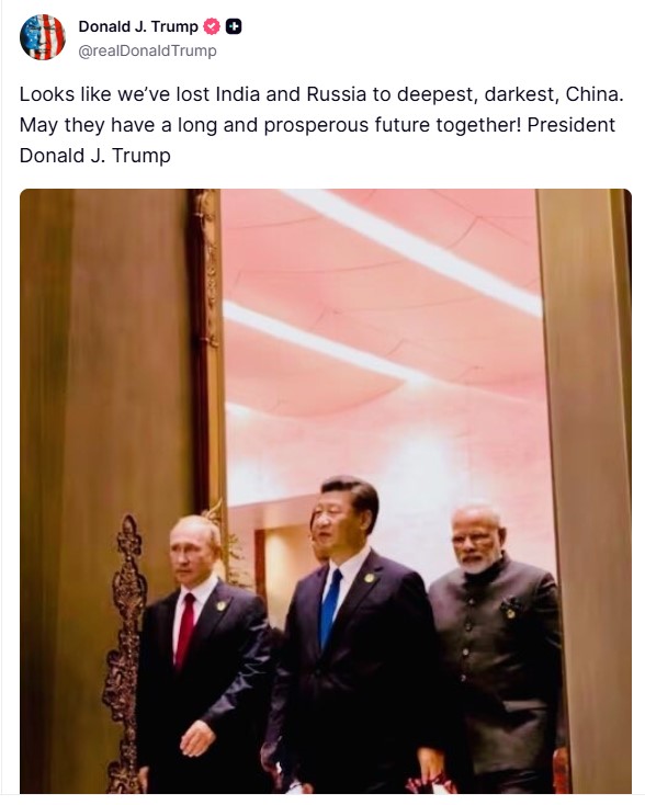 Τη στενοχώρια του για την «απώλεια» Ινδίας και Ρωσίας, καθώς οι δύο χώρες ενισχύουν όλο και περισσότερο τις σχέσεις τους με την Κίνα, εξέφρασε ο αμερικανός πρόεδρος, Ντόναλντ Τραμπ, με ανάρτησή του στο Truth Social, στον απόηχο και τις συνόδου του Οργανισμού Συνεργασίας της Σαγκάης (SCO) .