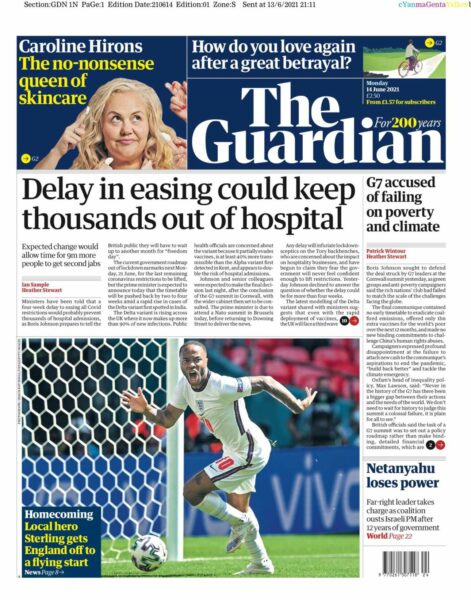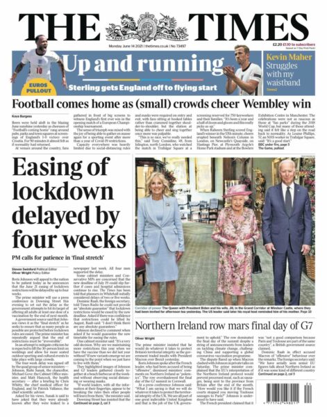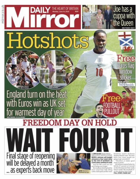 To πρωί της Δευτέρας, σύσσωμος ο βρετανικός Τύπος προεξόφλησε την παράταση των περιοριστικών μέτρων (και πανηγύρισε τη νίκη της Αγγλίας στο πρώτο της ματς στο Euro 2020).