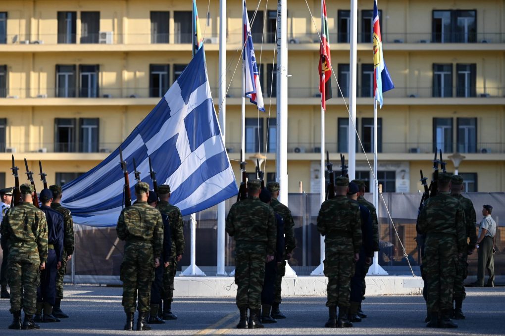 Στην κεντρική είσοδο του υπουργείου, ακίνητη και σιωπηλή, η πολιτική και στρατιωτική ηγεσία.