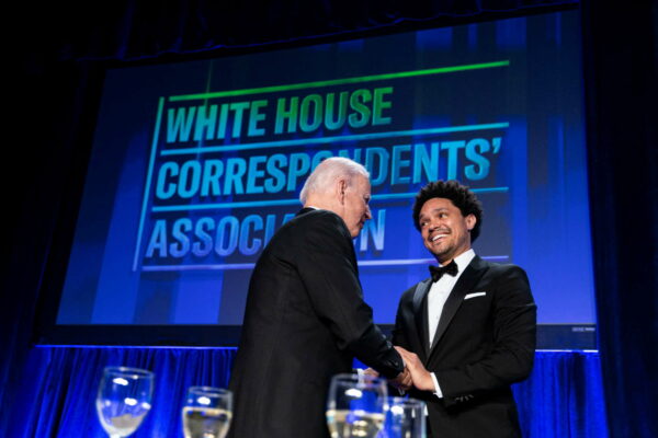 Σε μια ακόμη αποκατάσταση των παραδόσεων, ο πρόεδρος ήταν υποχρεωμένος να υπομείνει τα πειράγματα ενός κωμικού. «Σας ευχαριστώ που με καλέσατε εδώ. Ημουν λίγο μπερδεμένος. Γιατί εμένα; Μετά μου είπαν ότι έχεις τα υψηλότερα ποσοστά αποδοχής όταν δίπλα σου στέκεται ένας Αφρικανός», είπε στον Μπάιντεν ο Νοτιοαφρικανός Τρέβορ Νόα, οικοδεσπότης της εκπομπής «The Daily Show», και αμέσως στρίμωξε τον πρόεδρο στη γωνία: «Από τότε που έπιασες δουλειά, τα πάντα ακολουθούν ανοδική πορεία! Η βενζίνη ανεβαίνει, το ενοίκιο ανεβαίνει, τα τρόφιμα ανεβαίνουν, τα πάντα».