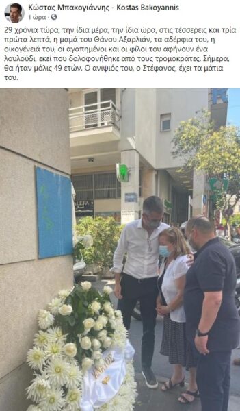 »Δυστυχώς κάποιοι, δεν διδάχθηκαν τίποτα και ακόμη και τους προηγούμενους μήνες οργάνωναν διαδηλώσεις υπέρ του εκτελεστή του 20χρονου τότε φοιτητή και τα προηγούμενα χρόνια του έδιναν άδειες για να επισκέπτεται τον τόπο του εγκλήματος. Ημέρες μνήμης σαν τη σημερινή υπογραμμίζουν τη σημασία και την αναγκαιότητα της απόλυτης καταδίκης κάθε μορφής βίας και τρομοκρατίας από όλες τις δημοκρατικές δυνάμεις χωρίς αστερίσκους και μισόλογα».