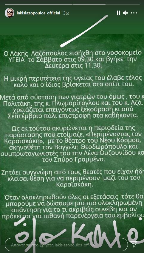 Στο νοσοκομείο χρειάστηκε να εισαχθεί το τριήμερο που πέρασε ο Λάκης Λαζόπουλος, ο οποίος μεταφέρθηκε εσπευσμένα σε ιδιωτικό νοσοκομείο το Σάββατο και πήρε εξιτήριο το πρωί της Δευτέρας.
