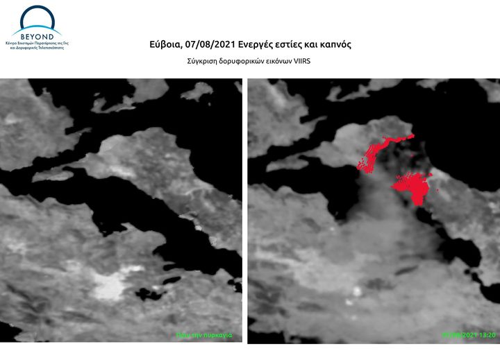 Ανανεωμένες εκτιμήσεις των καμένων εκτάσεων στη Βαρυμπόμπη και την Εύβοια, σύμφωνα με τις δορυφορικές εικόνες VIIRS της ευρωπαϊκής πλατφόρμας Forest Fire Information System (FFIS), έδωσε στη δημοσιότητα το Κέντρο BEYOND του Εθνικού Αστεροσκοπείου Αθηνών (ΕΑΑ).