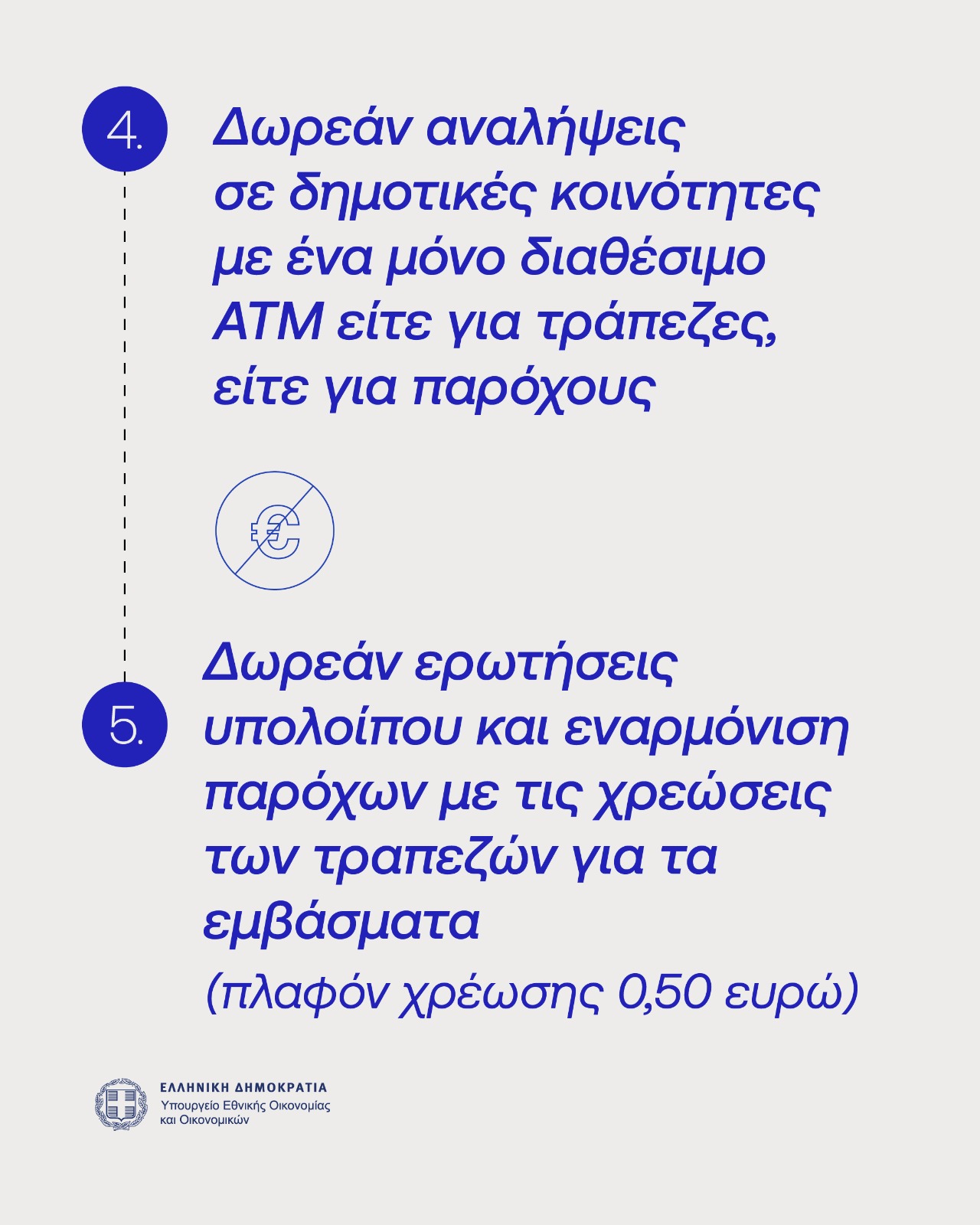 Παράλληλα, σε όλες τις δημοτικές κοινότητες όπου λειτουργεί μόνο ένα ΑΤΜ (είτε τραπεζικό, είτε παρόχου), οι αναλήψεις μετρητών θα πραγματοποιούνται χωρίς καμία προμήθεια, ανεξαρτήτως ιδιοκτησίας του ΑΤΜ. Επίσης θα νομοθετηθεί η άνευ κόστους ερώτηση υπολοίπου και θα τεθεί σε εφαρμογή πλαφόν 0,50 ευρώ για εισερχόμενα – εξερχόμενα εμβάσματα και για τους παρόχους, μέτρο το οποίο ίσχυε ήδη για τις τράπεζες.