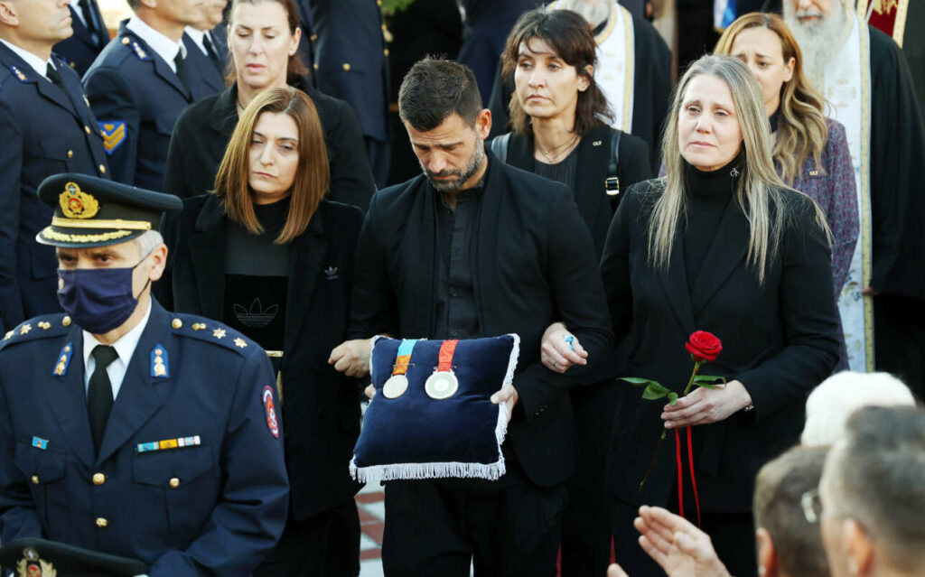 Το φέρετρο του ολυμπιονίκη περνά μπροστά από το άγημα του Πυροσβεστικού Σώματος