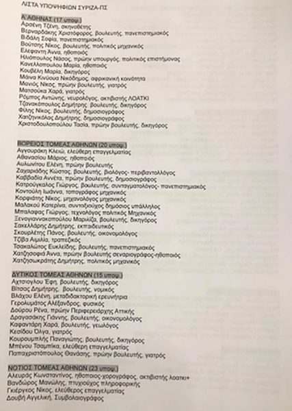 Στις λίστες των υποψηφίων υπάρχουν κάποιες εκπλήξεις, καθώς και μετεγγραφές από άλλους πολιτικούς χώρους, ενώ δεν λείπουν τα ονόματα του Παύλου Πολάκη (Χανιά) και του Γιάννη Ραγκούση (Β’ Πειραιά).