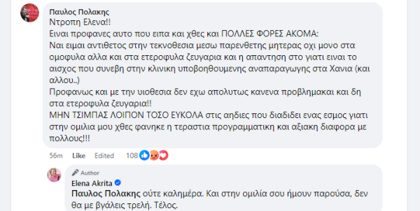 «Ντροπή Ελενα! Ειναι προφανές αυτό που είπα και χθες και ΠΟΛΛΕΣ ΦΟΡΕΣ ΑΚΟΜΑ: Ναι είμαι αντιθετος στην τεκνοθεσία μέσω παρένθετης μητέρας όχι μόνο στα ομόφυλα αλλά και στα ετερόφυλα ζευγάρια και η απάντηση στο γιατί είναι το αίσχος που συνέβη στην κλινική υποβοηθούμενης αναπαραγωγής στα Χανιά (και αλλού…). Προφανώς και με την υιοθεσία δεν έχω απολύτως κανένα πρόβλημακαι και δη στα ετερόφυλα ζευγάρια! ΜΗΝ ΤΣΙΜΠΑΣ ΛΟΙΠΟΝ ΤΟΣΟ ΕΥΚΟΛΑ στις αηδίες που διαδίδει ένας εσμός γιατί στην ομιλία μου χθες φάνηκε η τεράστια προγραμματική και αξιακή διαφορή με πολλούς!» της έγραψε.