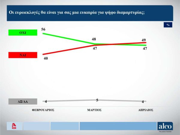 Την ίδια ώρα, πάντως, πολλοί πολίτες, περισσότεροι από όσοι τον Μάρτιο, δήλωσαν ότι βλέπουν την κάλπη των ευρωεκλογών ως «ευκαιρία για ψήφο διαμαρτυρίας», σύμφωνα με τα ευρήματα της Alco.