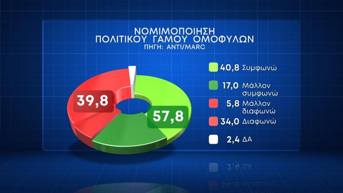 Το 57,8% απαντά ότι «συμφωνεί» ή «μάλλον συμφωνεί» με τη θεσμοθέτηση του πολιτικού γάμου για τα ομόφυλα ζευγάρια, ενώ το 39,8% «διαφωνεί» ή «μάλλον διαφωνεί».