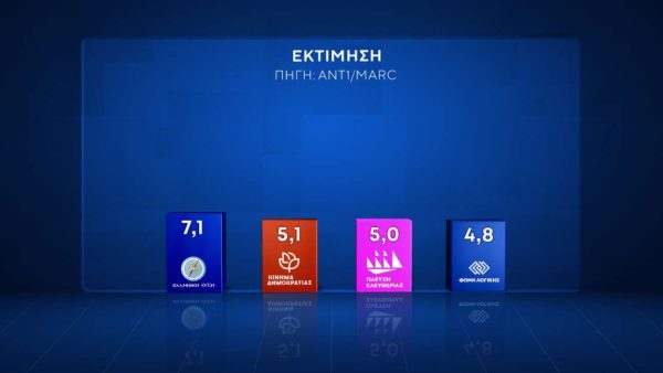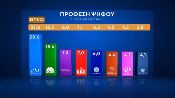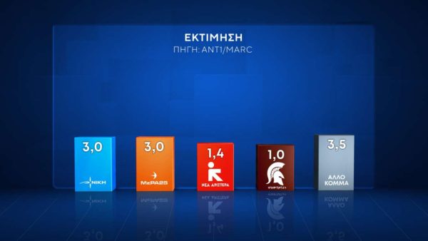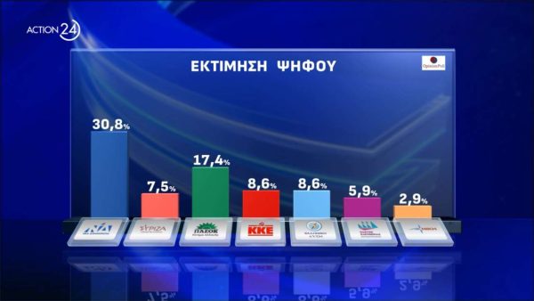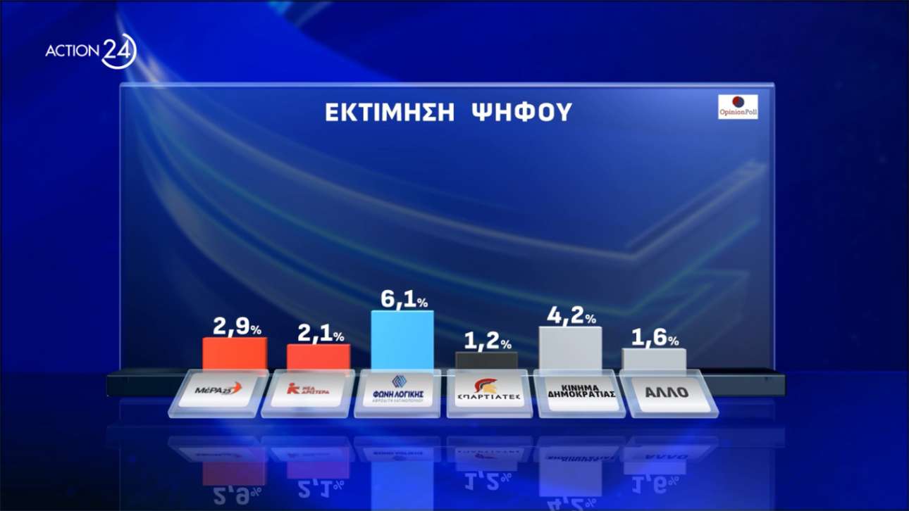 ΝΔ 25,1%, ΠΑΣΟΚ 14,2%, ΚΚΕ και Ελληνική Λύση 7%, ΣΥΡΙΖΑ 6,1%, Φωνή Λογικής 5%, Πλεύση Ελευθερίας 4,8%, Κίνημα Δημοκρατίας 3,4%, Νίκη και ΜέΡΑ25 2,4%, Νέα Αριστερά 1,7%, Σπαρτιάτες 1%, Αλλο 1,3%, ΛΕΥΚΟ/ ΑΚΥΡΟ 2,8%, Αποχή 3,3%, Αναποφάσιστοι 12,6%.