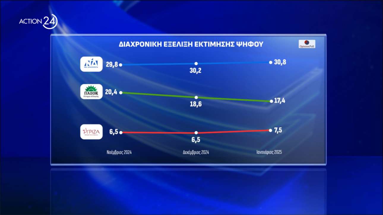 Απόσταση 13,4 μονάδων χωρίζει τη ΝΔ από το ΠΑΣΟΚ και στην εκτίμηση ψήφου της Opinion Poll, καθώς το κυβερνών κόμμα μετρήθηκε στο 30,8% (από 29,8% τον Νοέμβριο, 30,2% τον Δεκέμβριο), ενώ το ΠΑΣΟΚ βρίσκεται στο 17,4% (από 20,4% τον Νοέμβριο, 18,6% τον Δεκέμβριο).